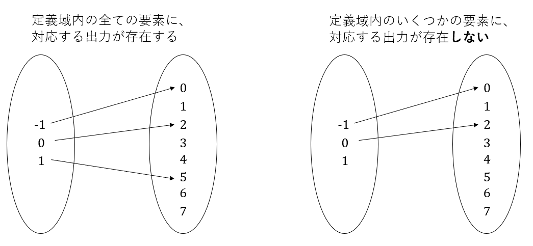 fが関数であるには二つの条件がある。一つは定義域内の要素全て(=すべての入力値)に対応する要素(=出力)が存在すること。