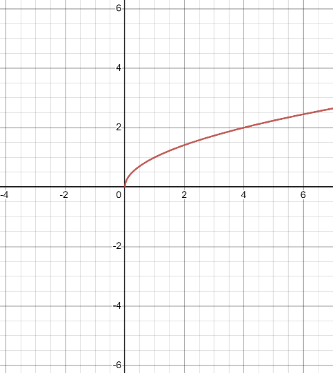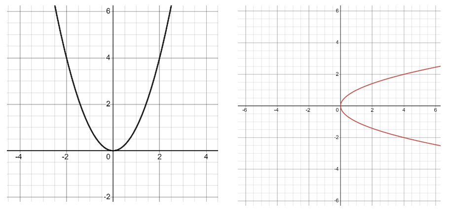 左のグラフは、それぞれのxについて一つの出力値しかないため、関数であるといえる。一方で、右のグラフは(0を除く)それぞれのxについて対応する二つの出力値があることが分かる。例えば、$x = 4$に対応するy値は2と-2だ。よってこのグラフは関数を表すものではない。実は右のグラフは$y =\sqrt{x}$のグラフである(注意したいのは、ここであえて$f(x) =\sqrt{x}$と表現するのではなく、$y =\sqrt{x}$と表現していることだ。xとyの関係性を結ぶだけであれば(=図形に注目したい場合)、関数の条件を気にする必要はない。)。 $y=\sqrt{x}$という方程式を解いたとき($x = 0$でない限り)答えは+と-の二つになる。だから一つのx値について二つのy値が存在しているのだ。