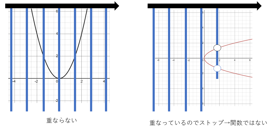 グラフを使い図形の関数判断をする方法を一般化させたものに、"Vertical Line Test"がある。「同じ入力に対して、二つ以上の出力が無い」というのを言い換えれば、y軸と垂直な直線を用意してグラフの上を左右したとき、その直線の上に二つ以上の点が存在しないということ。よって、グラフのy軸と平行に指を左右に動かし、もし重なった部分があれば、その図形関数でないということが分かる。