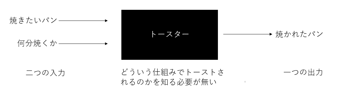 ここで重要なのは、関数が数学だけにしか存在しないと考えないことだ。広義に考えると、関数というのは、1) 入力があり、2) その入力値に対して何らかの処理をし、3) それを出力値として返す、機能のある全てを指す。よって、私たちが日常で使うものは大体関数だ。例えば、トースターがそうで、パンを焼くときトースターにパンと焼き加減を「入力」して、何らかの仕組みでそのパンがトーストされ、それが「出力」される。ここで重要なのは私たちは、パンがトーストされる仕組みを考えなくても(この仕組みを考えるのは工学と物理の分野だろう)、ただパンとボタン一つでパンを焼くことができるということだ。